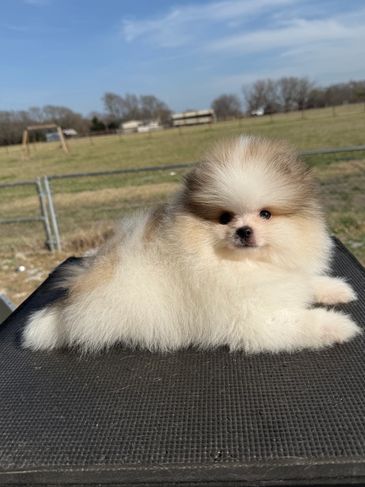 This stunning orange parti boy has such an outgoing and bouncy personality , He has such beautiful features to him ! he is charting about 5-6lbs he is a thicker build/ thicker boned guy like his parents and grand parents . i would love to see him shown but not required.